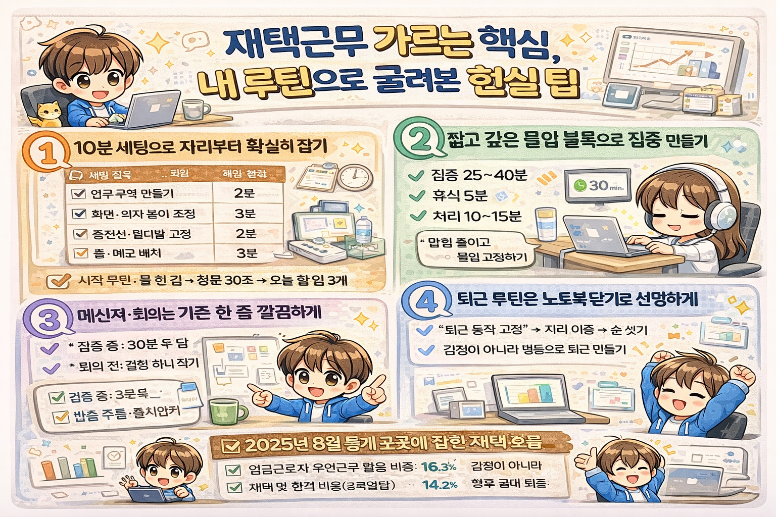 근데 이건 개인 의지 문제가 아니에요. 통계청이 2025년 8월 경제활동인구조사 근로형태별 부가조사 결과에서 임금근로자 중 유연근무제를 활용하는 비율을 16.3%로 제시했거든요. 유연근무를 쓰지 않는 사람 중에서도 향후 활용 희망이 48.3%로 잡혀서, 많은 사람이 같은 고민을 안고 있는 셈이에요. 재택근무를 제대로 굴리는 법은 요령이 아니라 생활 기술에 가깝더라고요.